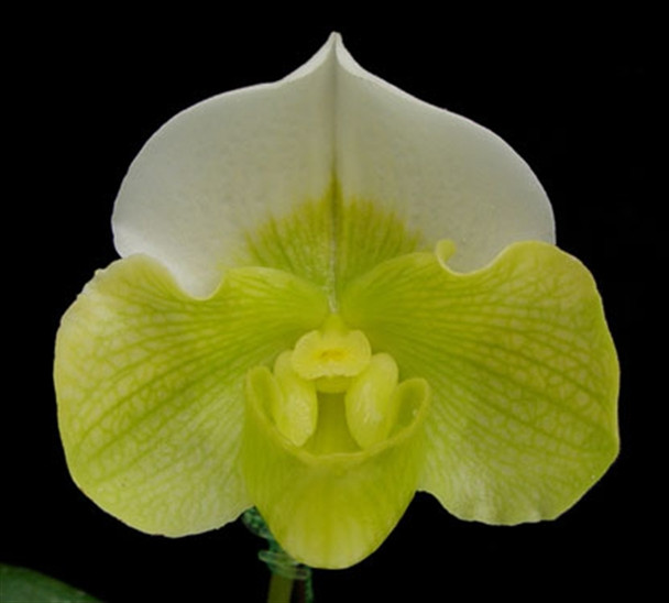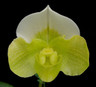 This should be a great white complex cross. Paph. Victoria Crossing 'Vicki' has huge green flowers with a white and green dorsal. Paph. White Queen 'Snowball' is one of our best complex white clones with perfectly shaped white flowers with a dusting of small red spots. The first seedling that bloomed (see picture) had light green to chartreuse flowers with a white with green dorsal and excellent shape. This cross will have some winners!