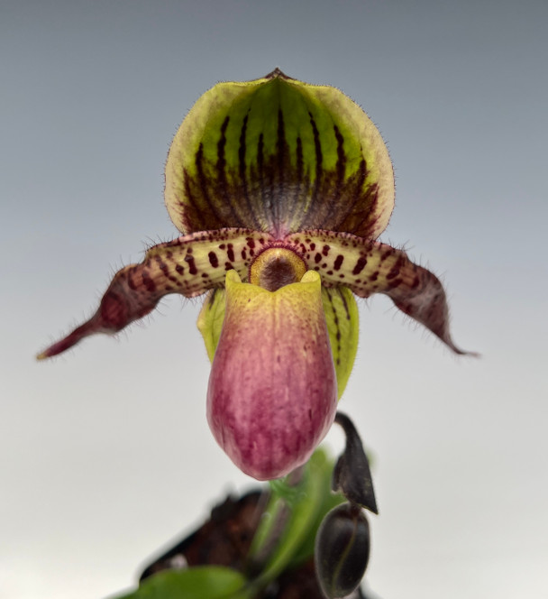A unique combination of a subg. Cochlopetalum (successive blooming) crossed with a Polyantha (multi-floral), resulting in down-swept petals from the adductum, and green/purple tones from the lieminaum. These are flowering at a compact size in 3.25" pots! We are growing these in a pine bark mix, sometimes including a small amount of pro-mix or milled sphagnum for extra moisture as Cochlopetalum are very thirsty!