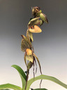 This is a beautiful multifloral cross between Paph. Michael Koopowitz and Paph. rothschildianum. These plants get 3 to 5 flowers per stem with long pendulous petals. These are large select plants, being 30 inches across. These take several years to get this large. Very limited, 4 plants available.