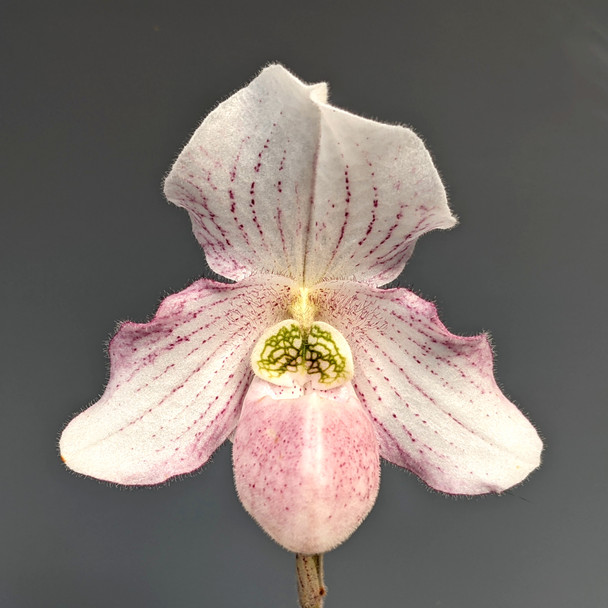 This miniature pink and white Paphiopedilum hybrid blooms with a column that is accented by a web of spectacular green venation! When watered adequately, this hybrid will produce multiple buds when blooming. These orchids have mottled leaves 4" in leaf span, with flowers that are are 2.5" large.