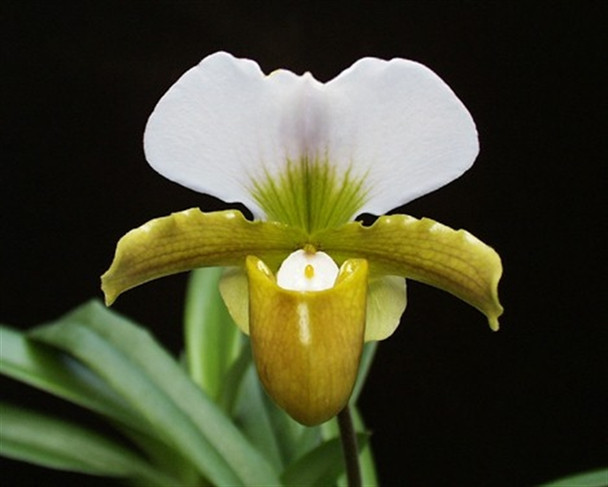 This hybrid is the result of crossing a complex green Paph to the species Paph. charlesworthii. We only have one division for sale of this clone.