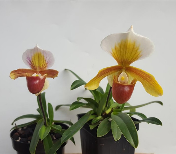 A tea cup Paphiopedilum using our favorite mini parent, helenae. Using Paph helenae is very advantageous in breeding as it keeps the growths compact and tight, often allowing multiple flowers to bloom in just a 2 to 3-inch pot size. In addition, helenae hybrids are easy to grow, making this the perfect miniature hybrid for any orchid enthusiast! The current batch is in low-spike and should be flowering by late August!