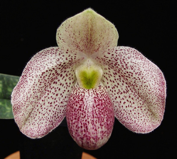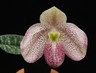 This is a primary hybrid between Paph. bellatulum and Paph. vietnamense. The flowers are white to pink with fine spotting. The petals open flat but do curve and reflex back with time.