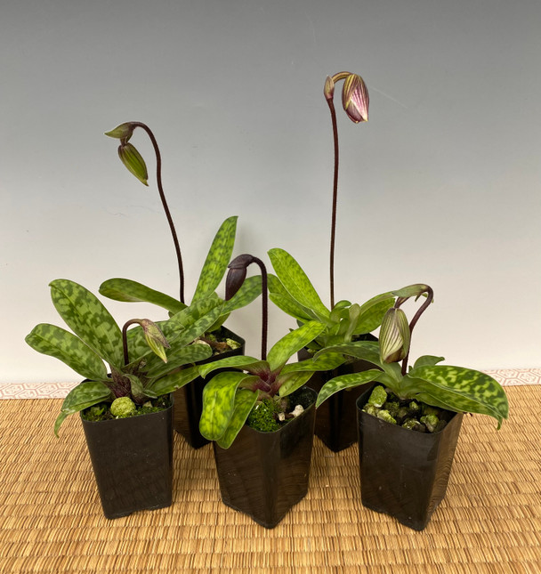 A variety of assorted crosses between Maudiae type and other Paphiopedilums.