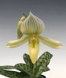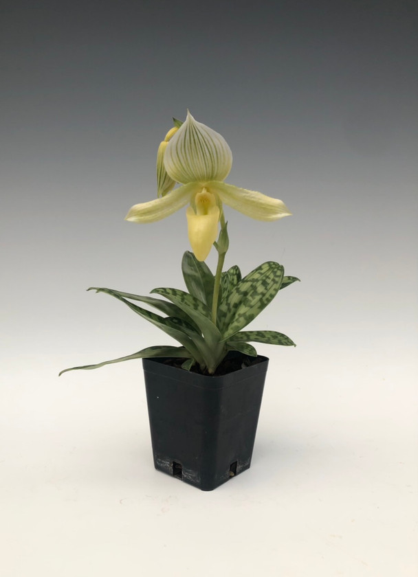 Individual listing for this beautiful, flowering specimen of Paphiopedilum Oriental Allure Album. This is an elegant flowered Paphiopedilum with flowers colored in combinations of white, yellow, and green. This Southeast Asian lady slipper orchid not only has beautiful flowers, but beautiful foliage as well. Easy to grow, shade loving plants. Water twice per week if potted in a bark mix.