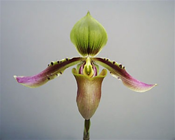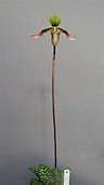 A beautiful species native toBorneo, Sumatra, Sulawesi and pennisular Malaysia, this species has gone through a variety of names and a lot of confusion. Many lump these all in the name of bullenianum but we grew bullenianum many years ago when they were fresh imports and the true bullenianum has purple on the undersides of the leaves. The foliage is beautiful and the tall graceful flower spikes are erect and bear a singular 3-4 inch flower colored with deep pink petals and green, tan and mahogany segments. Easy to grow and reliable in flowering, this smallish plant is a delight to look at even when it is not in flower. The flowers last about 2 months.