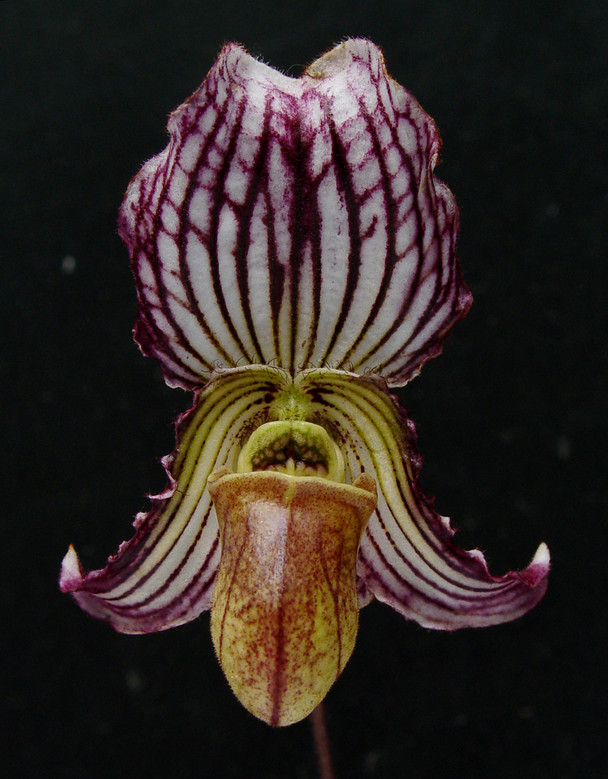 Paph. fairrieanum has sometimes been referred to as the dutch bonnet orchid. We just think they are weird and wonderful. This species which is native to India makes some incredibly beautiful hybrids. Grow in intermediate to cool temps in winter for best results.