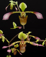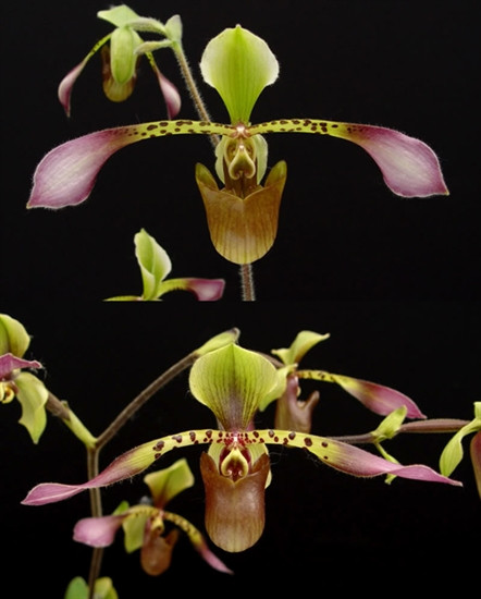 We crossed the 'regular' strain of Paph lowii to the 'Horizontal' strain of Paph. lowii. The 'Horizontal' strain of Paph. lowii originated from Kalimantan, Borneo. It is different from the regular Paph. lowii, by having more compact plants, with stiff leaves that stand more upright. Also the flowers tend to have petals thas stand out more horizontal and finally the dorsal is almost entirely green. The picture shows both parents. The 'Regular' plant was a cross between 'Low's Dream' x 'Purple Flame'.