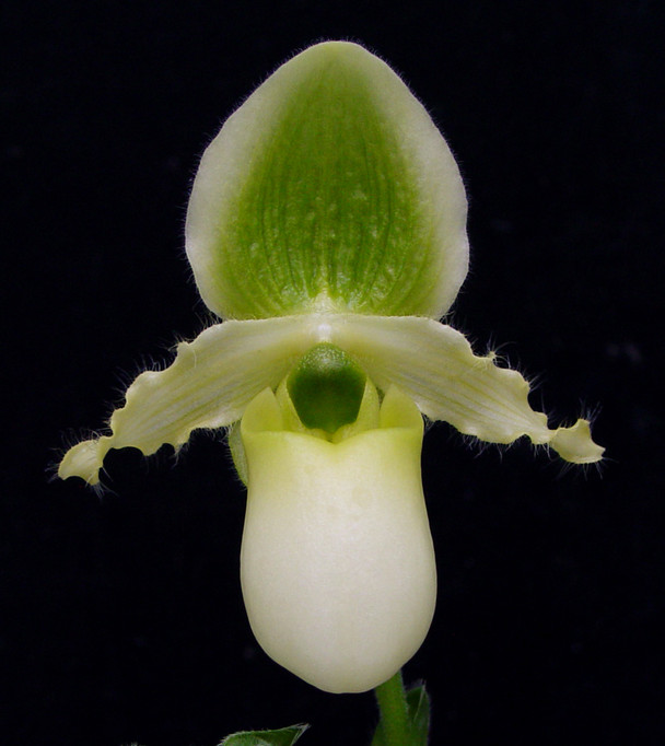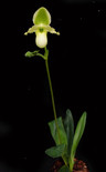 Paph. primulinum flavum 'Kings Crown' is a tetraploid (4N) clone with bigger flowers, and more intense yellow flowers than the regular 2N Paph. primulinum's. Another advantage is that the flowers are thicker and longer-lasting compared to a diploid. We crossed this tetraploid plant to one of our select (2N) Paph primulinum's. The result should be a more vigorous plant than a tetraploid, but with larger and darker colored flowers compared to a regular diploid primulinum. The seedlings have only been a year out of the flask, and have already shown to be very vigorous. The picture shows the first 3N seedling that bloomed out of this cross. The flowers are 7.5 cm wide and tall. Awesome plant!