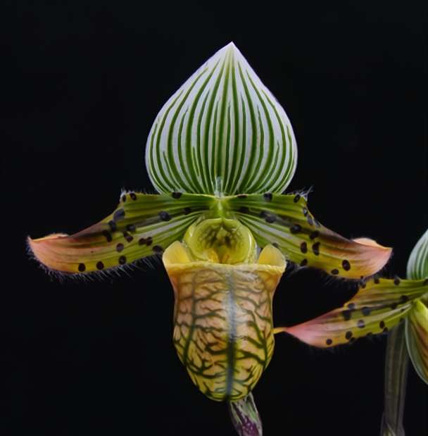 A slipper orchid species native to Assam (India), northeastern Bangladesh, the eastern Himalayas, Bhutan, Nepal, and China’s Yunnan province. This plant prefers moist roots and low light, and it grows well in cool to warm conditions. Its beautifully patterned foliage makes it attractive year-round, whether in bloom or not.