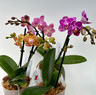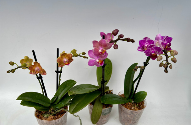 Save 20% with this Mini Phalaenopsis combo! These first-time blooming size Phalaenopsis clones bloom at the 3" pot size with spikes that reach about 8" in height. This combo pack includes 'Vivid', Pinlong Cheris x Sogo Gotris (fragrant) and Sogo Vivien (standard leaf, not variegated).