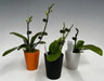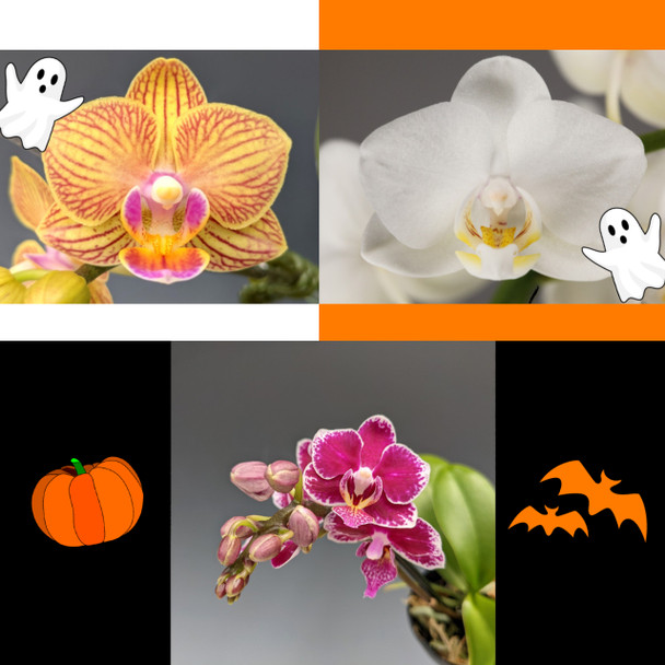 Don't miss out on this cute and spooky Halloween-themed orchid package! Save 20% with this Mini Phalaenopsis combo that comes in a Halloween-themed pot combination of orange, black and white decorative pots. These first-time blooming size Phalaenopsis clones bloom at the 3" pot size with spikes that reach about 8" in height. This combo pack includes Phal. 'Honey Bee', Phal. Hornglin Whitequaze and Phal. 'Dark Cherry'.