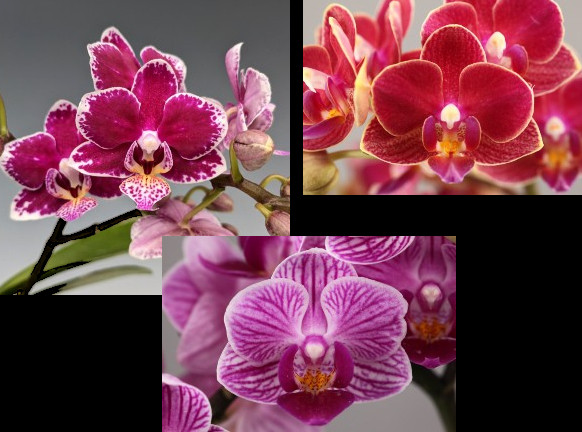 Save over 20% with this Mini Phalaenopsis combo! These first-time blooming size Phalaenopsis clones bloom at the 4" pot size with spikes that reach about 8" in height. This combo pack includes Phal. 'Dark Cherry', 'Little Strawberry', & Sogo Vivien with marginal variegated foliage.