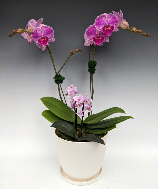 This latest arrangement featured one Phal. I-Hsin Pink Bubble Bath and one Phal. Jiaho's Pink Girl '#3'. Your gift recipient will be thrilled at the open flowers right out of the box!