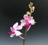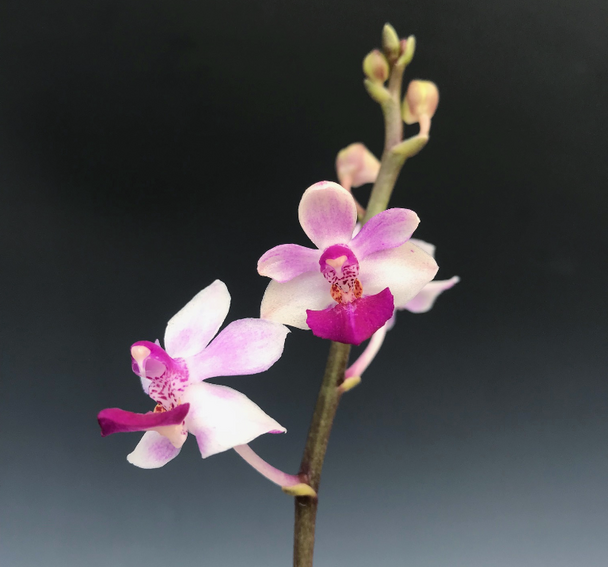 A beautiful miniature Phalaenopsis hybrid that produces lots of flowers on each spike. The colors will vary but will be white to light pink with a deeper magenta lip that has more mahogany and chocolate near the column. Some of these can be white or a darker purple as in the photos. Being tetrapolids the flowers will be larger and rounder than what is pictured.