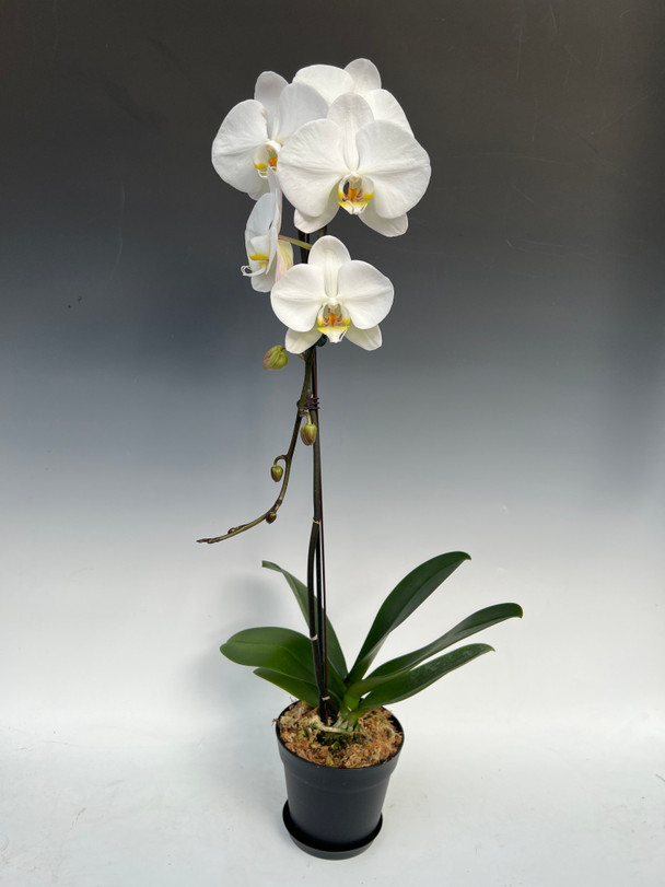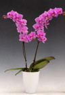 With a high count of perfectly spaced flowers, this delightful pink hybrid leaves little to be desired. A mid-sized Phalaenopsis, this orchid stands at 18 inches when in-bloom.