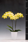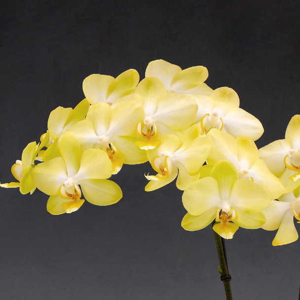 This floriferous yellow hybrid blooms with evenly sized petals and sepals that make for an elegant, rounded star shape. An intermediate-sized bloomer the flowers are around 2.5 to 3 inches in size, the spikes stand at about 10 to 14 inches tall. Comes freshly potted up using New Zealand sphagnum moss, so you won't need to repot for at least a year. The flowers are waxy and very long lasting.
