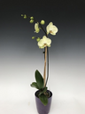 A unique Phalaenopsis hybrid with green/yellow tones overlapping white. Measures about 25" high from the bottom of the pot to the top of the flowers.