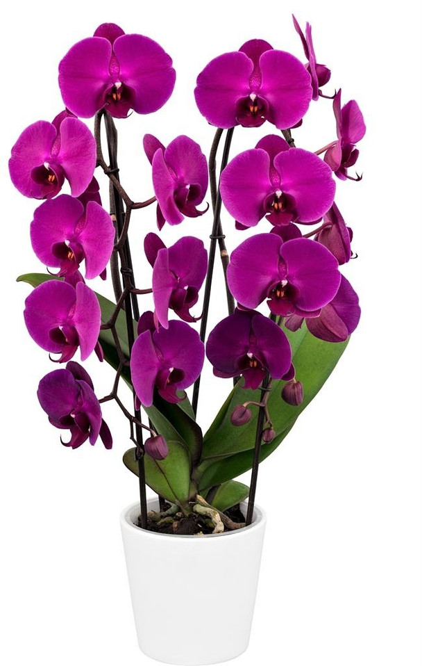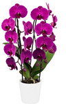 One of the intense deep purple Phalaenopsis hybrids that is more compact in size. The flowers are in the three to Four inch range. Long lasting flowers.