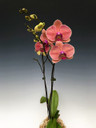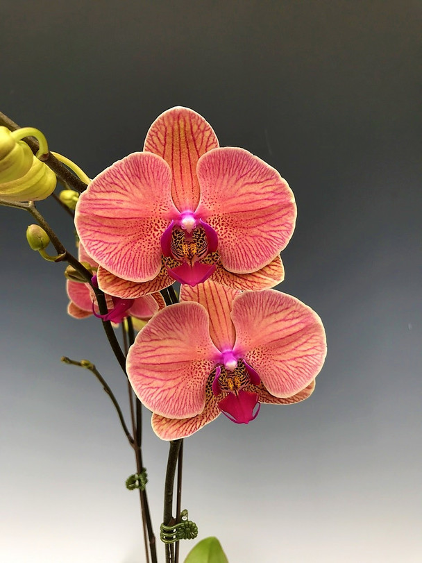This is a beautiful clone with nice orange flowers that have darker red orange stripes and magenta lips.