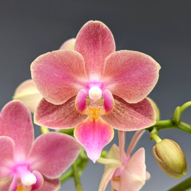 A compact plant with small pink-orange flowers that will create branching stems as they mature. This easy-growing, intermediate-sized orchid stands at about 17" In-Spike and comes recently potted up into a 5" pot, so it will not need repotting for at least a year!