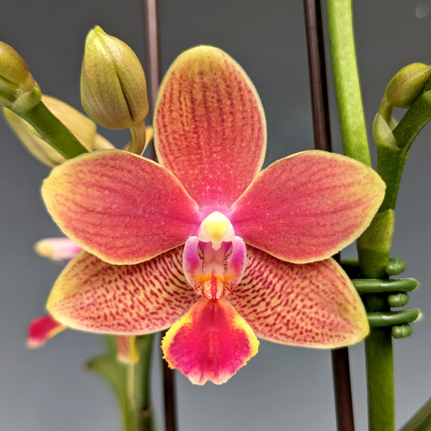 A beautiful, mid-sized Phalaenopsis with plants standing about 12" tall from bottom to top of the flower spike. The spikes produce a good amount of buds with 1.75" wide flowers that have a slight citrus fragrance to them as they mature.