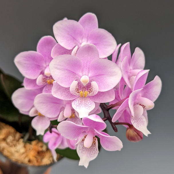 This cute miniature clone has a dark pink color in its petals. This first-time blooming size Phalaenopsis clone has a unique flower pattern for a mini Phal., thanks to one of its parents being Phal. schilleriana. These adorable orchids bloom with spikes that reach about 8" in height! The schilleriana parent also makes these slightly fragrant which is a lovely bonus. As they grow larger, they are capable of branching spikes that produce a higher flower count, making for an impressive miniature specimen.