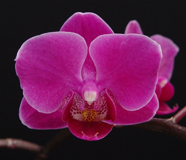 A cute miniature Phalaenopsis with small dark pink flowers.