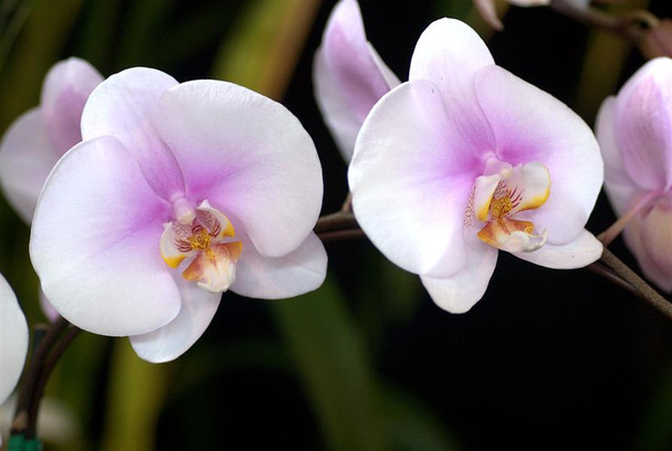 A beautiful multifloral Phalaenopsis hybrid with large white flowers exhibiting a pink/purple blush. The leave of this variety even exhibit their own reddish blush as well.