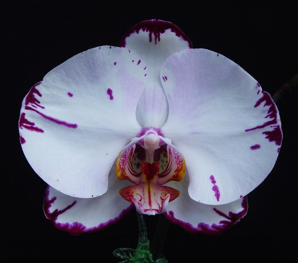 Nice harlequin type flower with a dark red to purple edge, and white petals with a light pink blush. Each plant comes with one flower spike.