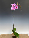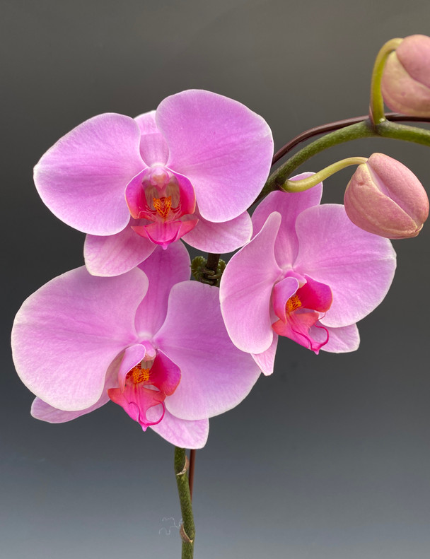 Simple pink flowers on very tall stems. At the peak (we arch them over on wire) this variety stands 36 inches tall! Perhaps these may compliment tall windows/ceilings more than standard Phalaenopsis.