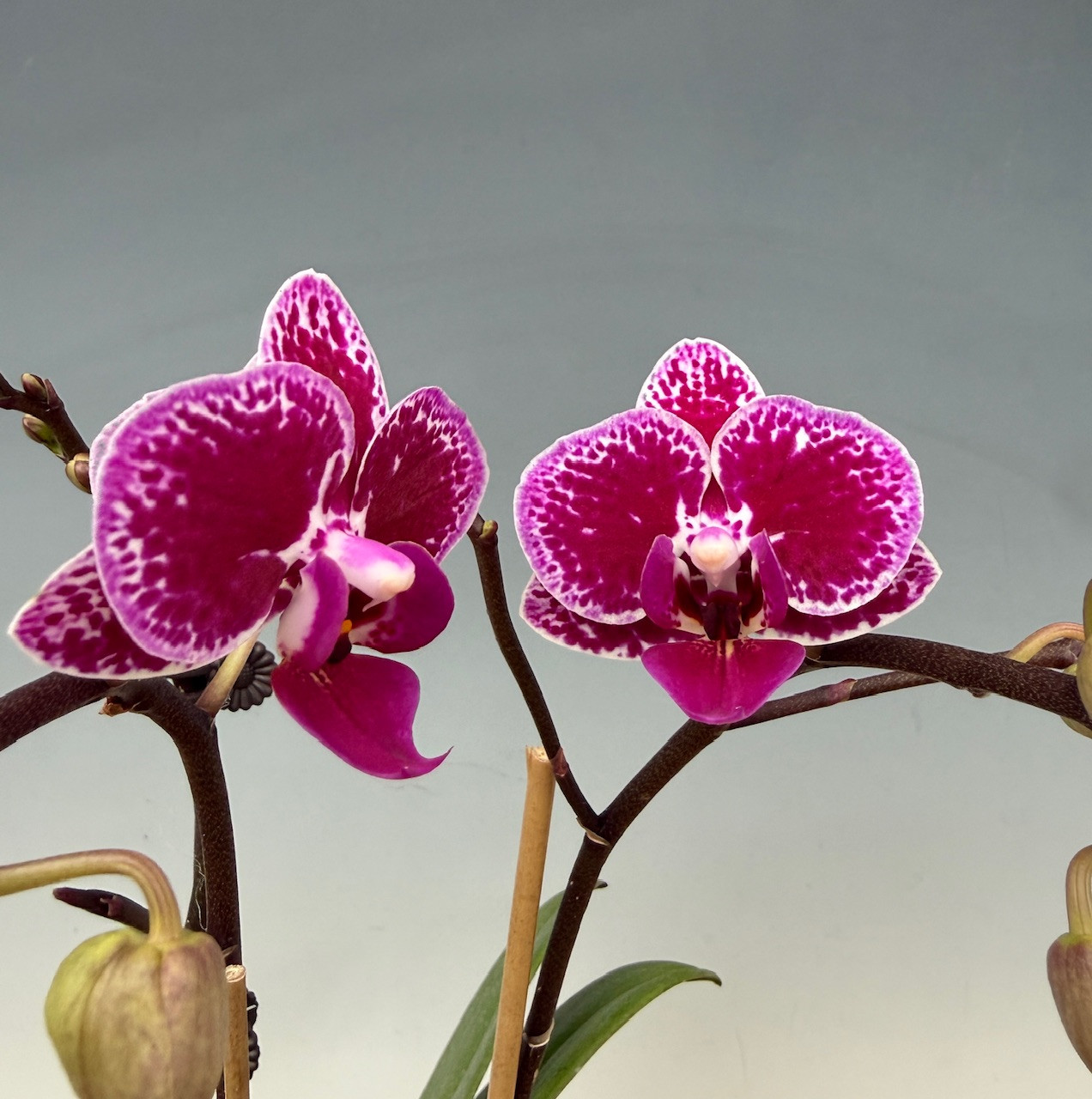 Pink flowers covered in heavy dark raspberry blush. These Phalaenopsis have tall stems and measure about 33" from the bottom of the pot to the top of the flower spike. All double stem plants.