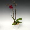 This Phalaenopsis hybrid blooms with fantastic, 3.5" wide crimson flowers that are accented by a purple border. This orchid comes potted in an elegant white pot with matching saucer, standing at a combined height of around 24" tall.
