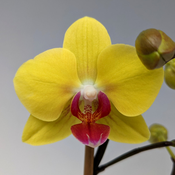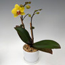 This wonderful compact hybrid blooms with saturated yellow flowers accented by a red lip. This easy growing Phalaenopsis is a perfect choice for small spaces or as an accent plant on desks and other small areas. Comes in a decorative, glossy-white pot with matching saucer.