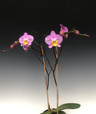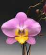 A unique color combination for a Phalaenopsis. The entire lip is a bright golden yellow, giving a lovely contrast to the pink petals. Tall 30" branching stems make for a big show when in full bloom.