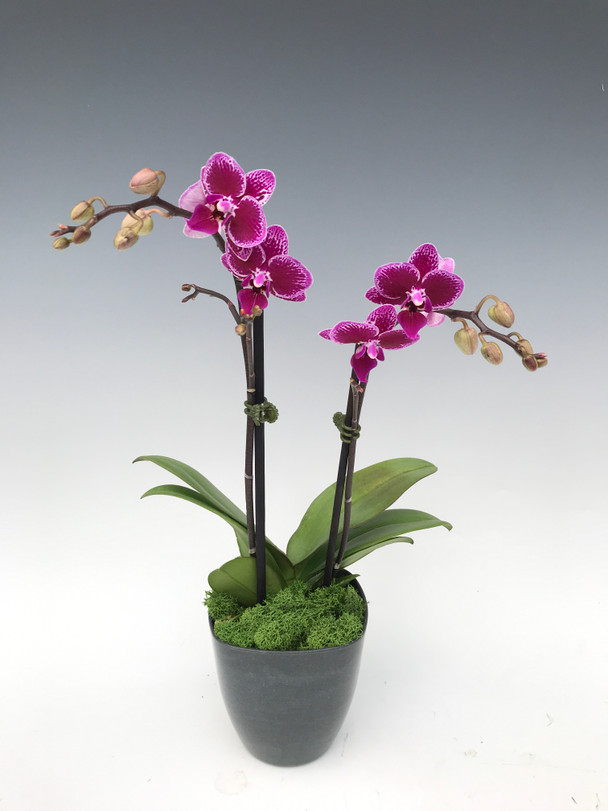 A compact Phalaenopsis with a pink picotee surrounding a deep raspberry color. Product in photo is in a gray decorative container. The decorative containers are eco friendly and made out of rice hull.
