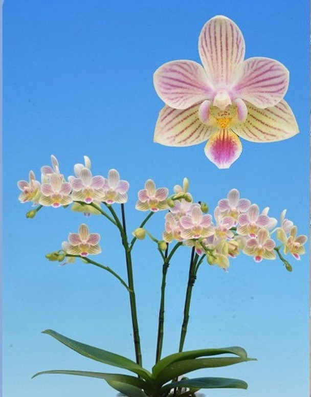 A petite, midi-sized Phal. with a fun combination of yellow and pink flowers! We've sold these before as micro-mini, but now these plants have grown to the 'midi' size and will have more flowers, similar to this example photo.