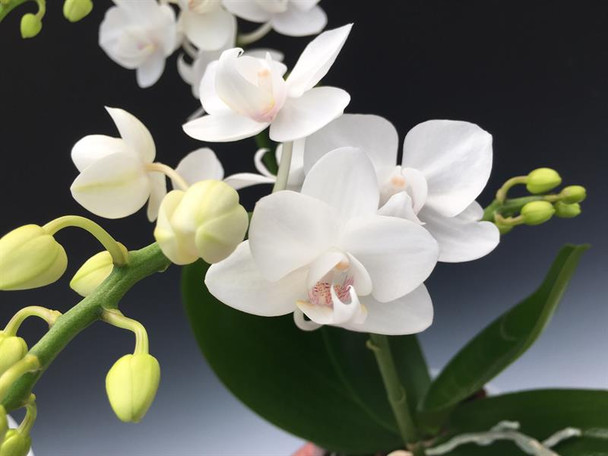 A beautiful mini white Phalaenopsis with a nearly pure white flower, just a bit of yellow on the pollen cap and some small reddish stripes inside the lip near the column. The lip remains white though with a little sulfur yellow at the back of the lip. Lots of flowers are produced on these plants that have a pretty normal to compact size to them. These plants are free flowering and the inch and a half flowers are produced on spikes that can branch.