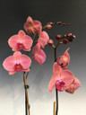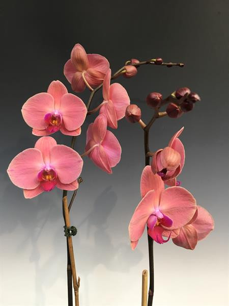 Healthy two-spike Phalaenopsis hybrids with intense salmon and orange flowers. Plants stand about 26" tall from the bottom of the pot to the top of the spike. Phalaenopsis are easy to care for with long-lasting flowers, making them excellent low maintenance house plants and gift plants.