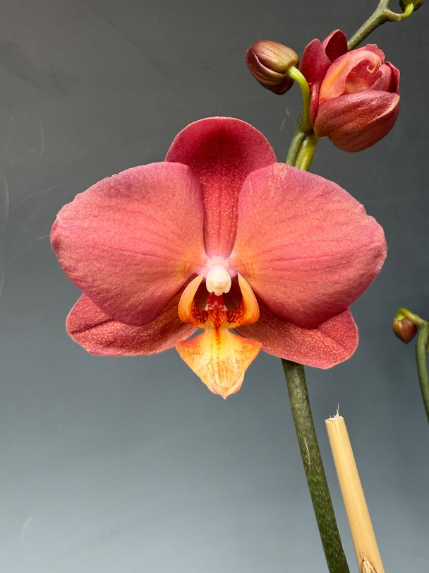 Previously, we had a Taisco Peach that had purple flowers with a yellow lip. This one is also a Taisuco Peach, but with a salmon-orange color with a hint of lavender. This is a striking color on a tall, beautiful stem!