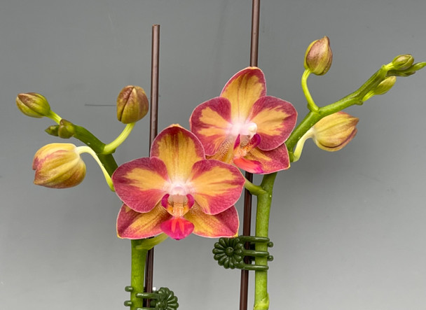 This hybrid blooms with exciting, orange and yellow flowers accented with pink brush strokes along the petal edges. Colors reminiscent of the Painted Desert in Arizona. Easy growing and a compact plant habit make this a perfect plant for small spaces or as an accent plant on desks or other small areas. Stands at a combined height of 12" and comes in a decorative pot with matching saucer. An excellent gift option!