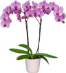 A medium sized Phal. with pink flowers that have slightly darker upper petals and lighter lower petals. The flowers have very fine spots throughout and the lip is an interesting combination of burgundy, white and yellow.