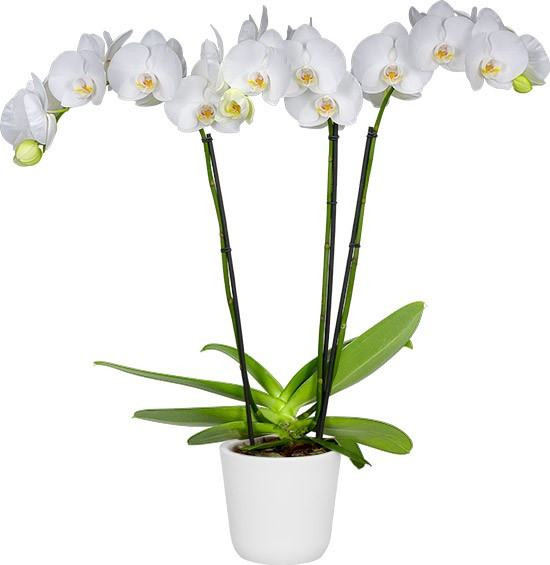 A medium sized white Phalaenopsis with an average 24" to 27" height from base of pot to top of flower stem.