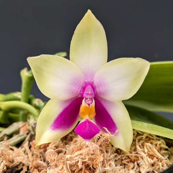 Native to Borneo, this species is adored for the very sweet fragrance that emits from the flowers. These start spiking in the spring, begin flowering in June, then continue to bloom into November. If grown under lights, this species can flower on a continuous basis. This cross utilized the famous 'Ponkan' AM/AOS parent, known for its large leaf and flower size. The resulting offspring produce round, star-shaped flowers with ivory petals and sepals. We are offering an individually listed plant grown from a cross made back in 2009.