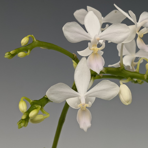 These plants are the predominantly white forms of the Philippine species, Phal. equestris, with the occasional light hint of pink in the lip. These orchids are fantastic, given that once the spikes start flowering we have seen them carry on blooming for two years or more! A very nice miniature that is hardy to boot. Easy to grow on the windowsill, under lights or in the greenhouse.