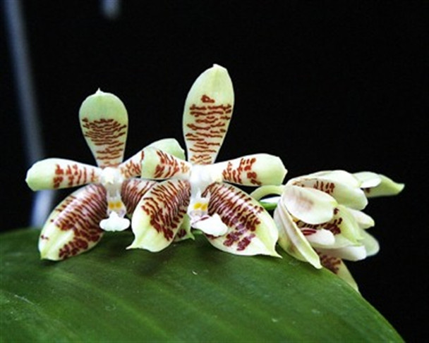 These are seedlings from two selected plants of Phal. inscriptiosinensis. The flowers are white to ivory in color with orange to mahogany bars on the petals.