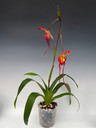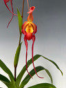 What a beautiful hybrid combination of the long-petaled species popowii and the fuchsia/pink Twilight! The popowii has elongated the petals while retaining bright colors from Twilight, making this a stunning show. In the past, this cross has produced yellow/orange tones mixed with red. So far, this current cross has been more on the dark red side like the example in this photo.