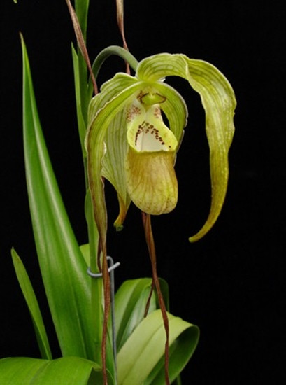 A tetraploid (4N) form of Grande was backcrossed to one of it's diploid parents: Phrag. caudatum. The result are triploid (3N) plants that have large flowers and very long petals with flowers that look very similar to Phrag. caudatum, but that are much easier to grow.