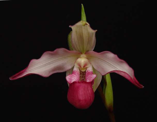 An oddly compact Phrag with flowers similar to Sedenii and Cardinale, but with a dark cherry colored pouch. There should be a slight fragrance of rose from the schlimii. Plants offered are blooming size.