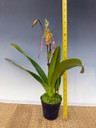 A primary hybrid with large foliage and down-swept, red petals with some length contributed from the warscewiczianum. Blooming-size plants are expected to flower between winter and spring.